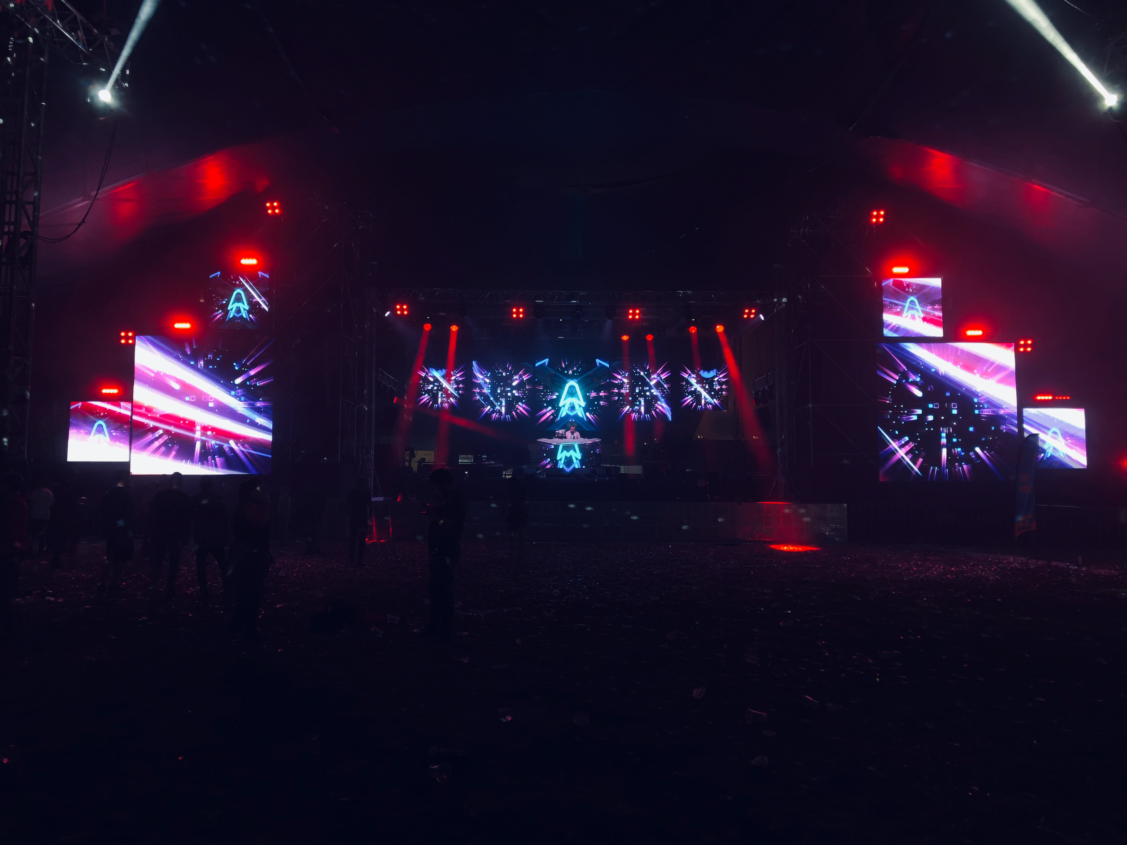We built a visual kit of neon grids, CRT scanlines, pixel rain, and geometric loops. As day faded to night, we dialed up bold typographic stingers, IMAG overlays, and colorways that flipped from vaporwave pastels to high-contrast strobes for the big drops. The goal was simple: make every chorus look like the memory feels.