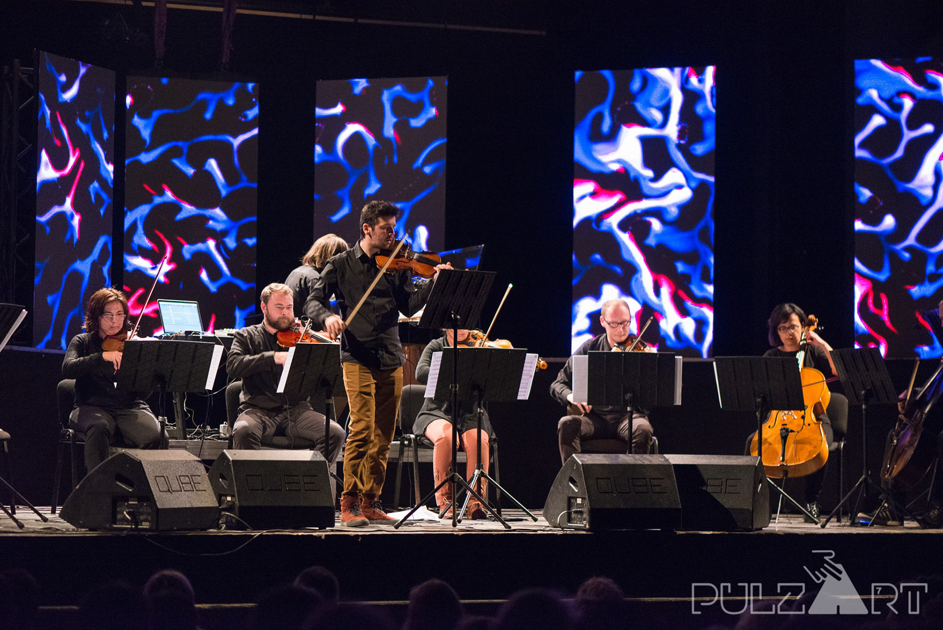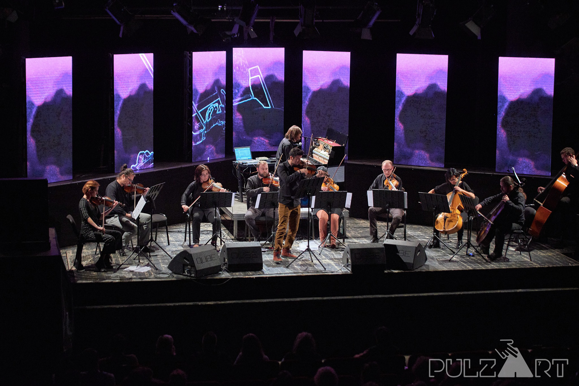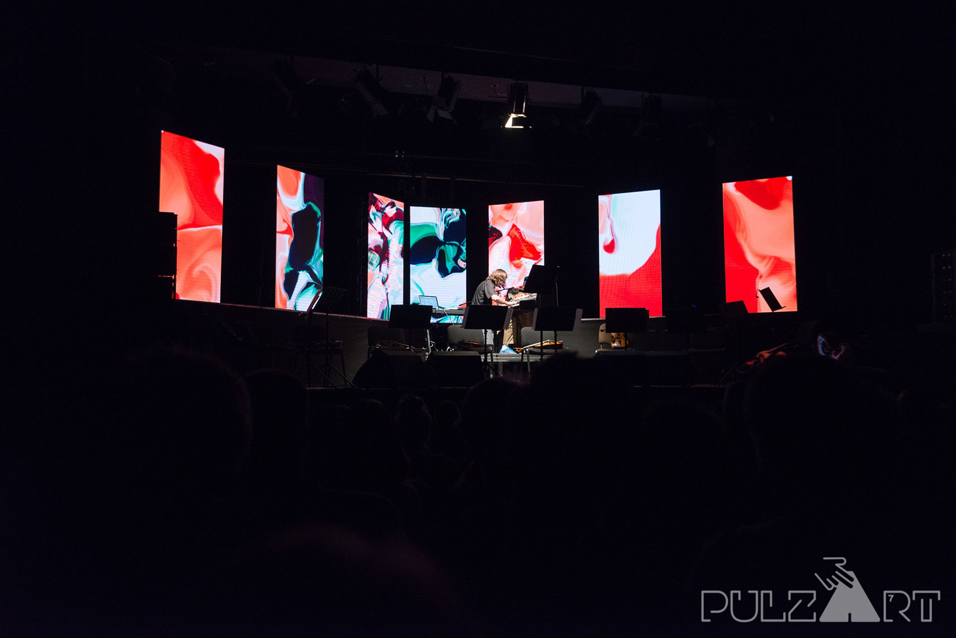 For pulzArt 2019’s closing concert we built a live, generative visual set—morphing geometry, audio-reactive patterns, and evolving textures—blended with a live camera feed presented in an artistic way. We composited IMAG into the motion layers using soft masks, feedback trails, and subtle grading, so performers appeared inside the visuals rather than on top of them.
